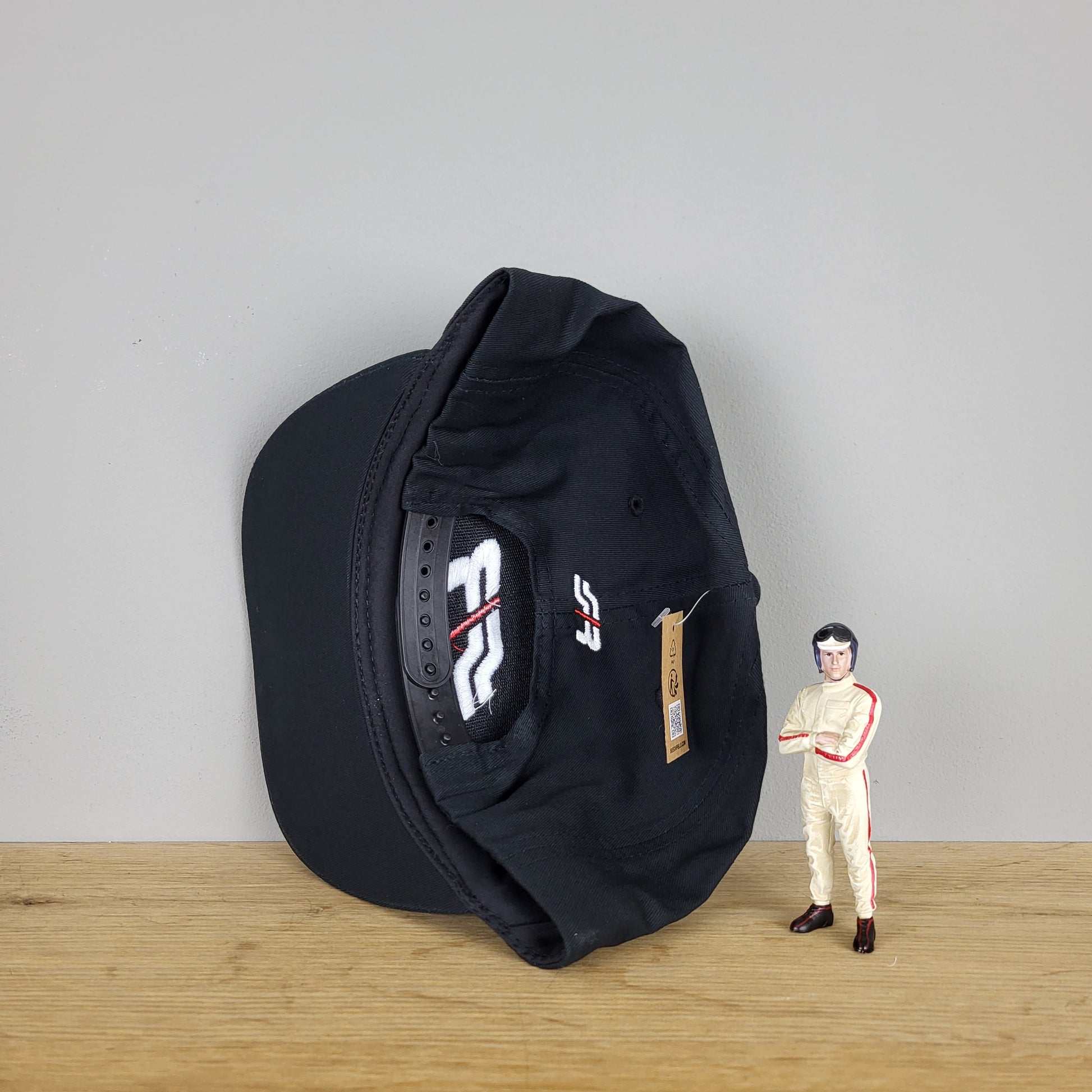 Black cotton Snapback hat with SR embroidered logo, adjustable.